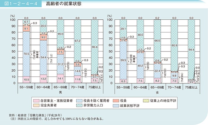 高齢者の就業状況についてみると、男性の場合、65~69歳で53.0%となっており、60歳を過ぎても、多くの人が就業しています。一方で、65~69歳の1.8%が完全失業者であります。また、女性の就業者の割合は、65~69歳で33.3%となっています。