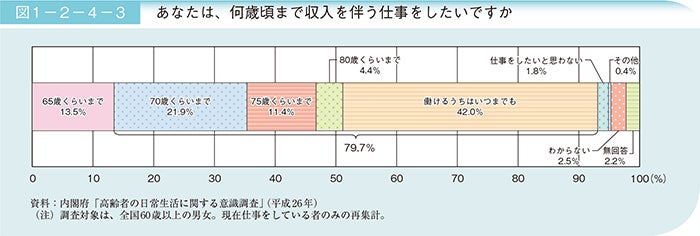 現在仕事をしている高齢者の約4割が「働けるうちはいつまでも」働きたいと回答しています。70歳くらいまで、もしくはそれ以上との回答と合計すれば、約8割が高齢期にも高い就業意欲を持っている様子がうかがえます。