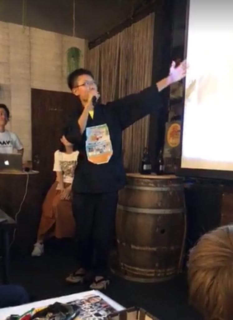 彼はなぜか作務衣に下駄という出で立ち。服の上からはこの日のために持ってきた『プロジェクト楽』のチラシを貼り付け、マイクを握り、