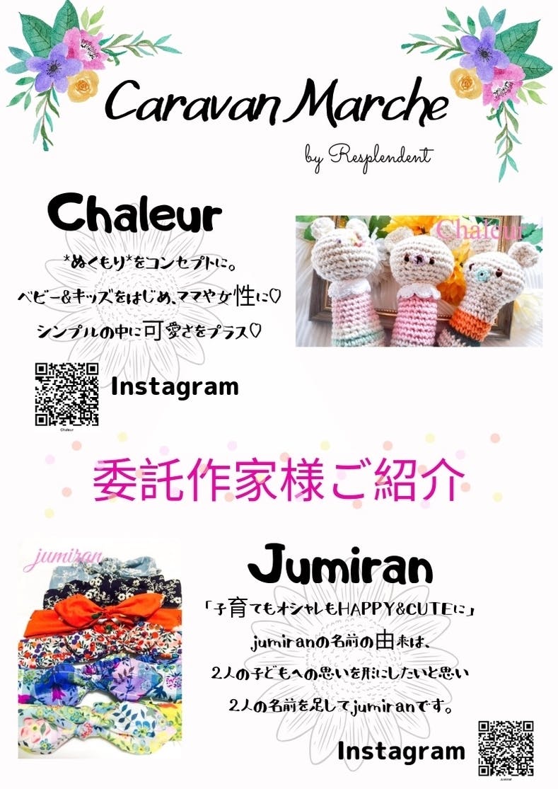 2019/04/23 21:23こんばんは。 ご無沙汰しております。 今現在の、キャラバンマルシェのご報告をしたいと思います。 結構、盛りだくさんでございますw 長文ですが、お付き合いくださいm(__)m はじめに、ご報告が遅くなり大変申し訳ございません。。 ご支援者様のお名前を、月初にHPへ掲載させて頂きました https://www.resplendentmami.com/blank ↑こちらからご覧下さいませ。 キャラバンマルシェは、4月13日より本格的スタートしました() 今現在の委託作家様は、現在2組。 どちらもベビーキッズ、ハンドメイドアクセサリーがメインの作家様となりますが さすが、ハンドメイド全くカラーが違い、素敵な商品ばかりです フライヤーを作りましたので、ぜひ作家様のインスタグラムをのぞいて観てください また、キャラバンマルシェ のバーナーフラッグもデザインして、 商品が届くのを待っている状況です。 近々のイベント出店スケジュールは以下になります ↓↓↓ 4月27.28日・・・ケセラ市 @アウトレットモールあしびなー(豊見城) 4月29.30日・・・親子WS(ケセラ市特別企画) @アウトレットモールあしびなー(豊見城) 5月4日・・・ぐしちゃん朝市 @南の駅やえせ (八重瀬町) 5月5日・・・伊江島物産センター(伊江島)<ゆり祭り 期間> 5月22日・・・なごみ @ちこさんち(八重瀬町) GWはほぼ活動しておりますので、お時間合いましたらぜひ遊びにいらしてください 飛んで喜びますw(実際は、恥かさーするかもですw) 5月5日の伊江島ですが、当初 ゆり祭り会場で、伊江島で活躍されている『しましまファーム』さんと共同出店する予定だったのですが、 ゆり祭りさん側から、伊江島の商品を扱っている方だけ出店して欲しいとの事で断念しなくてはいけない状態に・・・。 ですが、なんと! 『しましまファーム』さんのご厚意で、伊江島の港から目と鼻の先の 物産センター内の、しましまファームさんのブースをお借りさせて頂ける事になりました!! もし、5月5日ゆり祭りで伊江島へ行くご予定の方は物産センターへも遊びにいらしてください 話は変わりまして、 先日、キャラバンマルシェ のyoutubeチャンネルを開設致しました!! まだ1回しか発信できていませんが、 最低月3回は発信できればと思います。 <チャンネルはこちらから> ↓↓↓ https://youtu.be/1VlCKdMKI7g そしてそして!! 6月1日から、新しいスタイルをスタート致します 昨日、先方とのお話がまとまり出店者様募集をかけ始めたばりです 那覇市曙にあるショップ様。 こちらを月3−4回利用させて頂き、 移動販売の一環として、WS(ワークショップ)に特化したスペース&プチイベントを ハンドメイド作家様以外の、沖縄本島南部で活動るす方々とコラボイベントをすると クラウドファンディング挑戦中に公言していましたが、やっと形になります!! 梅雨の時期や、天気の悪い日でもへっちゃら 室内での、移動販売&WS(ワークショップ) 八重瀬町でイベントをしたいのですが、 イベント出店し、ブースへこられるお客様から色々話を聞いていると、 『八重瀬ねー。なかなか行こうと思わない。』 という、『遠い!!』という概念があるみたいです。 車で15分でも遠い!と言われる事もよくあります。 価値観は、人それぞれなのでoKなのですが、 まずは那覇で構築して ファンができたら、八重瀬まで絶対来てくれるので那覇で八重瀬のPRをまず頑張りたいと思っております。 のちに、中部、北部にも定期的にできるスペースを作り、 南部の方々の活躍できるスペースを作っていきたいと思っております。 現在決まっているスケジュールは 6月1日(土曜日)11:00−17:00 6月5日(水曜日)11:00−17:00 になります。 詳細や、情報はキャラバンマルシェ のインスタグラムをご確認頂ければと思います。 ↓↓↓ https://www.instagram.com/caravanmarche_by_resplendent/ 那覇空港から車で10分の立地で、 帰省されたウチナンチューの皆さん、海外の方々、県外の方々など、 気軽に入ってこられる雰囲気作りも工夫して、南部で活動される方々のアピールする場所を流行らせていくことが目標です。 沖縄本島南部の色んな方々の お役に立てます様に・・・ 引き続き、頑張っていきます もっと見るリターン品についてお知らせ
