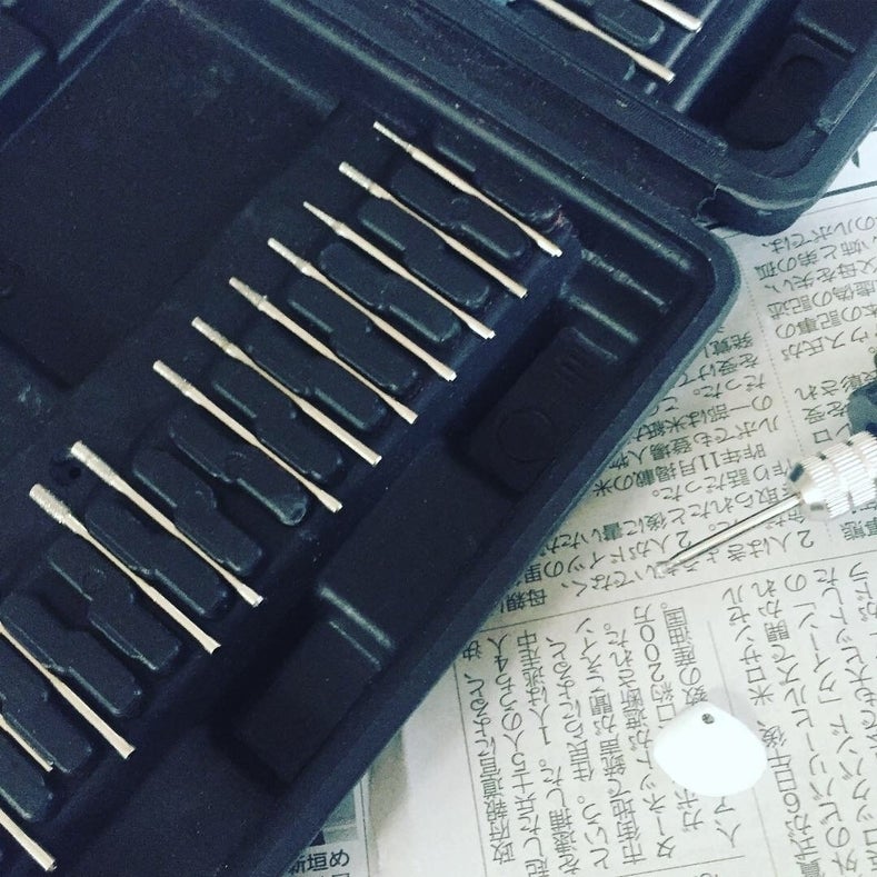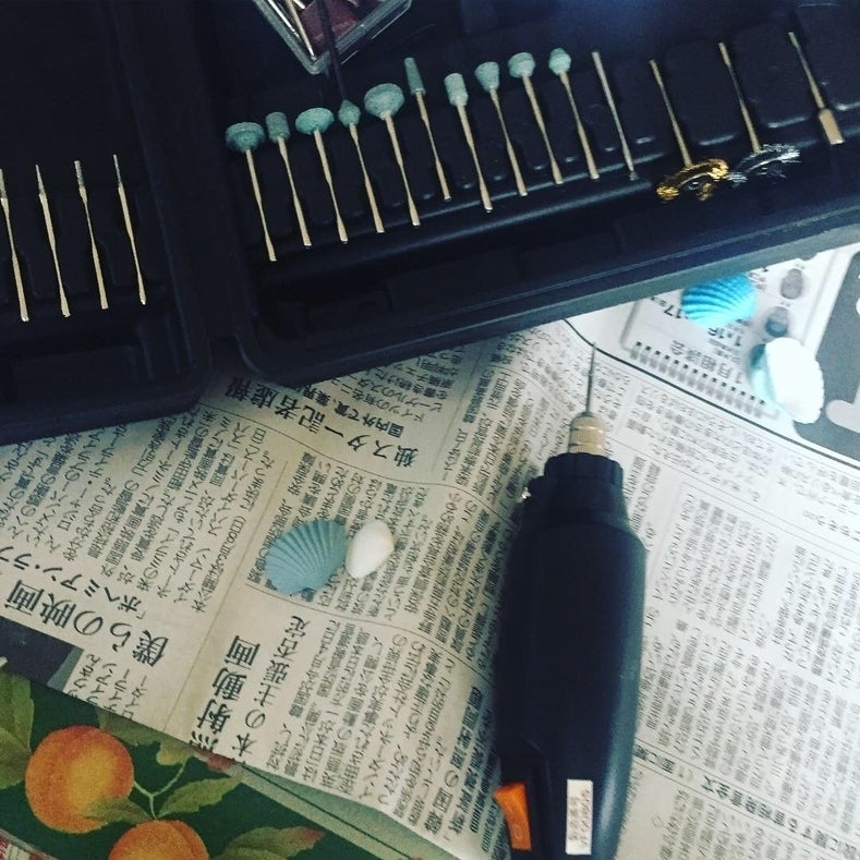 貝殻と、シーグラスもパーツに入れよう!って思いついたのは今日なので、いま穴あけ作業しております。