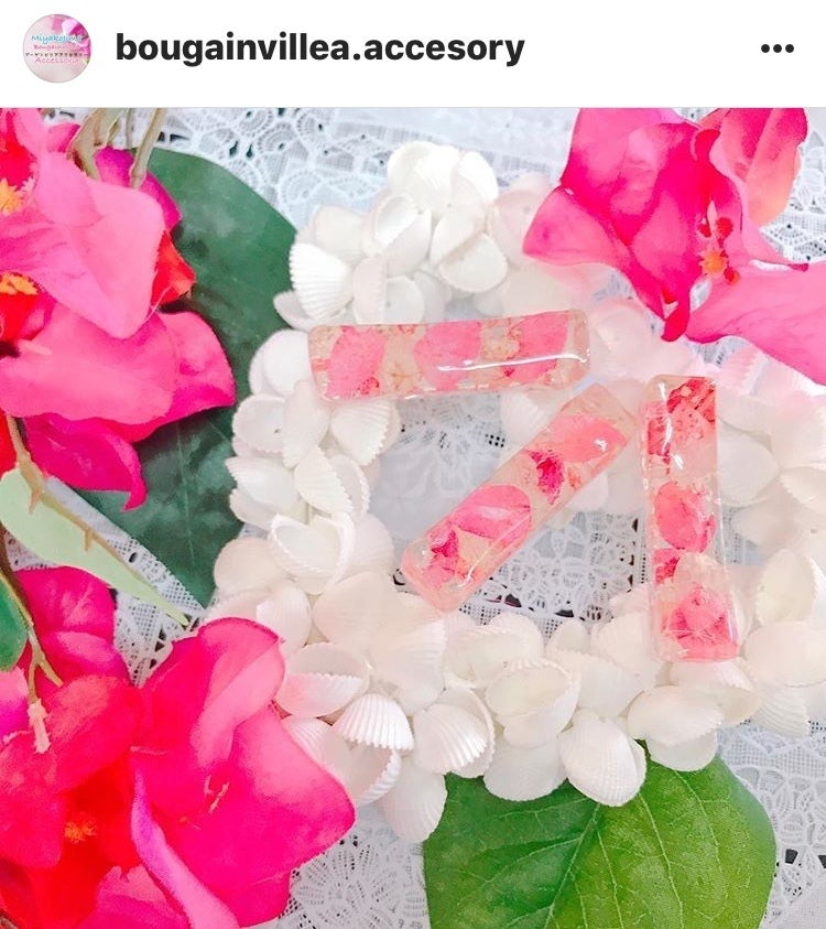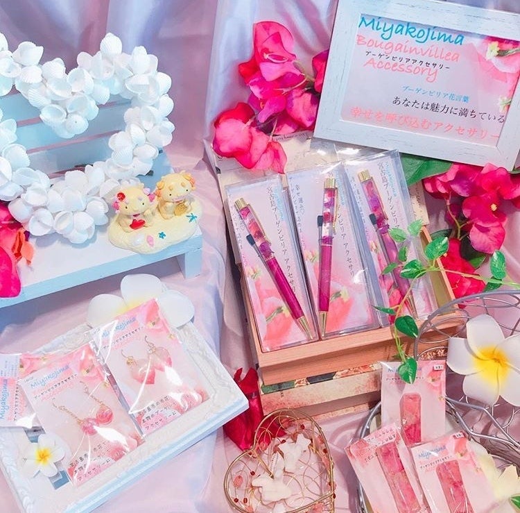 宮古島で、ご自身で育てられているブーゲンビリアで作ったアクセサリーなどの小物を販売されている