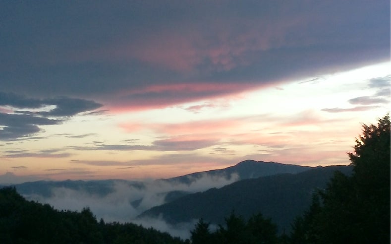 阿吽山房本館の裏山は眼下の谷に雲海が発生し、野鳥のさえずりの中で見る朝の景色は本当に美しく、また日没の頃の夕焼けも感動するほどの美しさです。