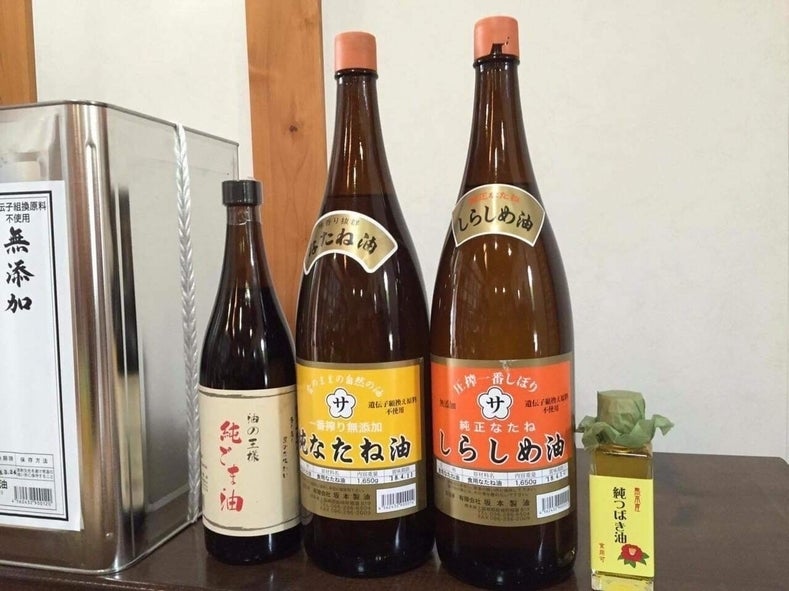 熊本地震で1番被害の大きかった益城町にある坂本製油さん(現在工場は建て直し中)の油は全て「古式圧搾製法」という薬剤を使用しない伝統製法で作られています。全て手作業でおこない、一番搾りのみを使用した無添加無着色の油は現在注文が出来ない程人気。大切な方へのプレゼントに最適です。