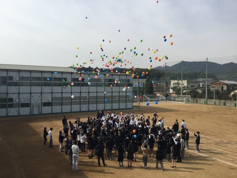 そして、真備の復興と文化祭成功を願って風船を飛ばしました。