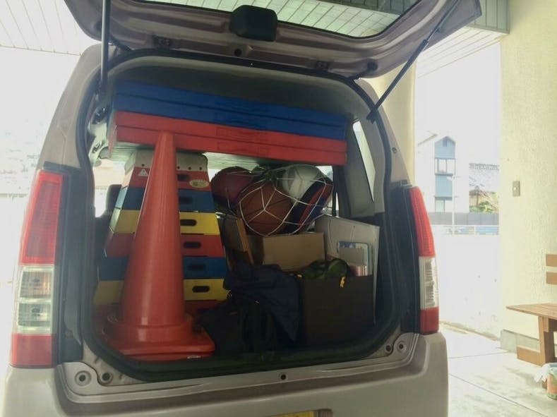いろんなの元になるスポーツ用具をたくさん車に詰め込んで海へ、山へ、おうちの庭へ!スポーツを使った “あそぶ!” を出前します!