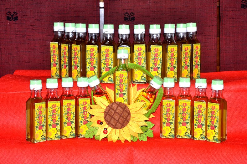 平成27年に初めてひまわりの種子から油を搾取し、イベントでひまわり油を使った天ぷらなどをふるまいました。揚げた野菜の油が口に残らず、とても好評でした。夏のイベントにはお素麺のトッピングにも使いました。高価な油なのに家族にどうしても試食させたいと油をお買い求めされる方もいらっしゃいました。