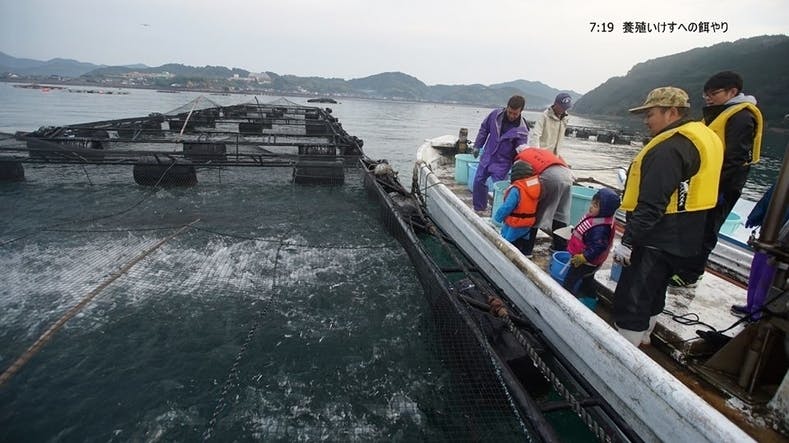 漁を終え、帰港する前に養殖魚に餌やり。