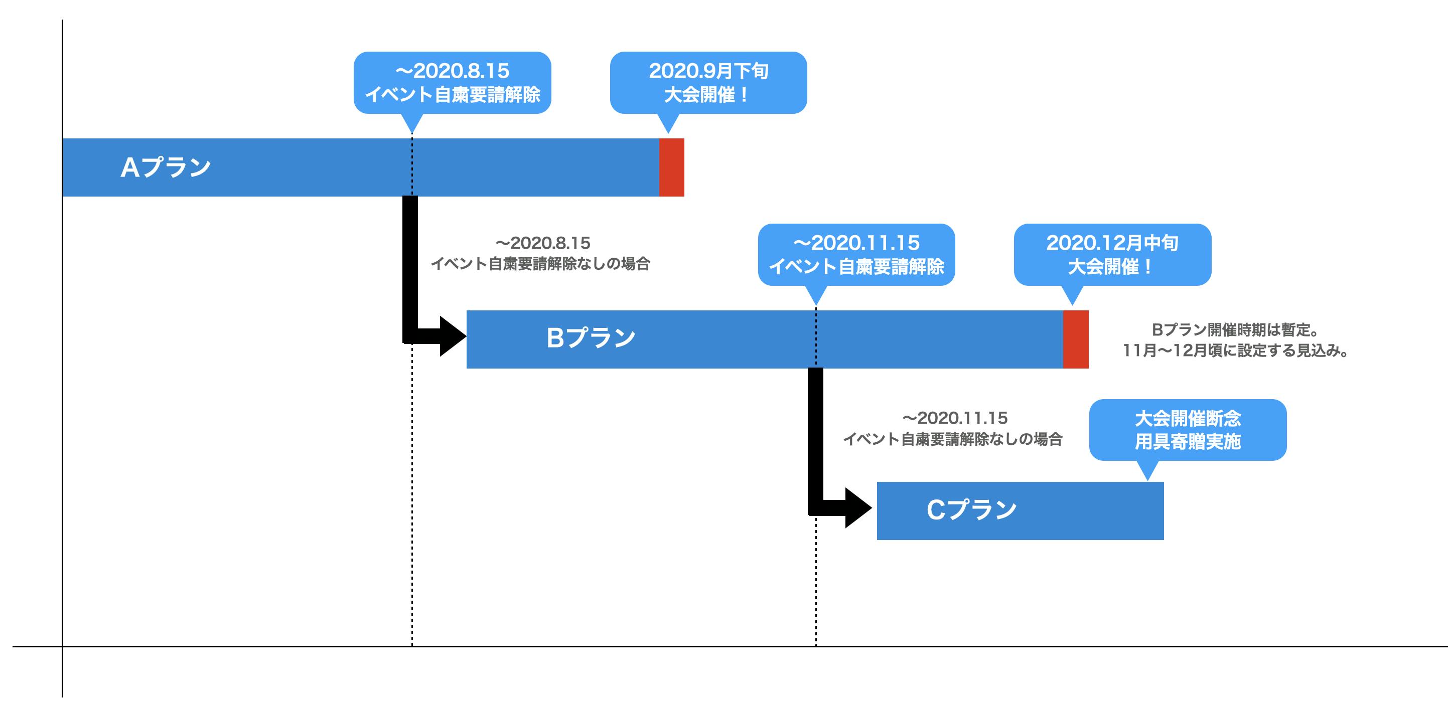 私たちは、政府・自治体による自粛要請等の状況に応じて、競技会の開催時期をスライドさせる方式を採用することにしました。