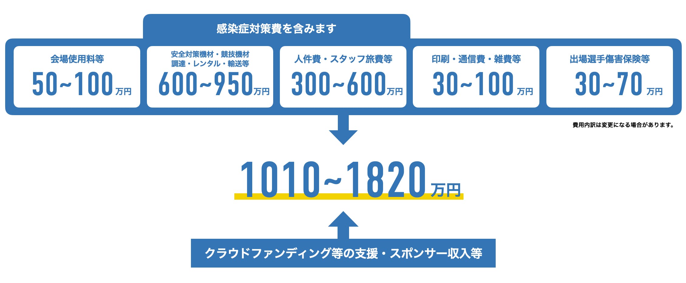 出場エントリー受付前の現時点では、開催費を確定させることは困難で、大きな幅があります。今後の感染症対策や状況の変化によって費用内訳が変わる可能性があります。