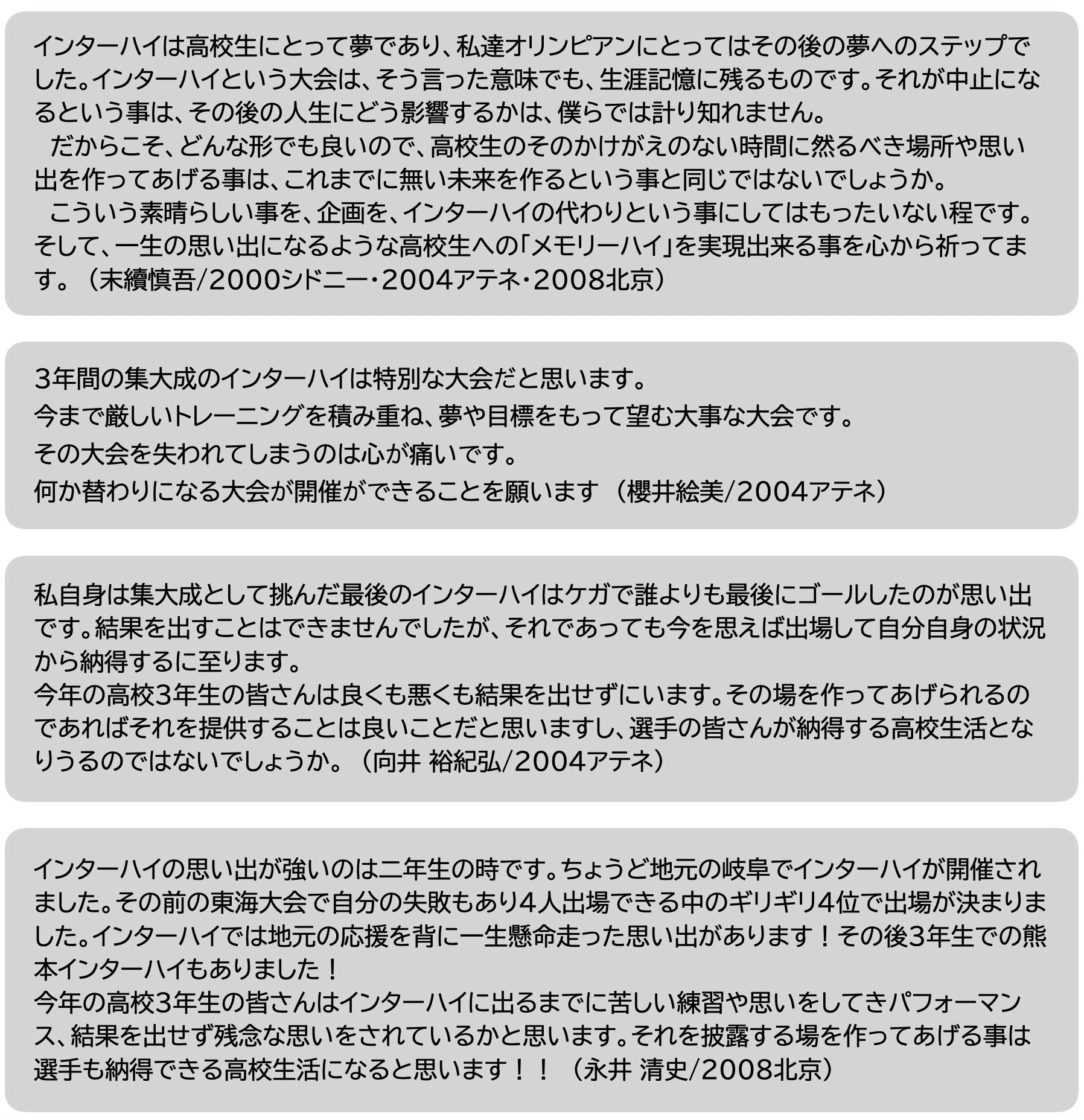 私たちのスポーツのフィールドでは、あらゆる競技会が中止になり、国内大会ではインターハイも中止となりました。青春をスポーツに捧げ、ひたむきに努力を重ねてきた高校生たちの無念を思うと、彼らにかける言葉もみつかりません。