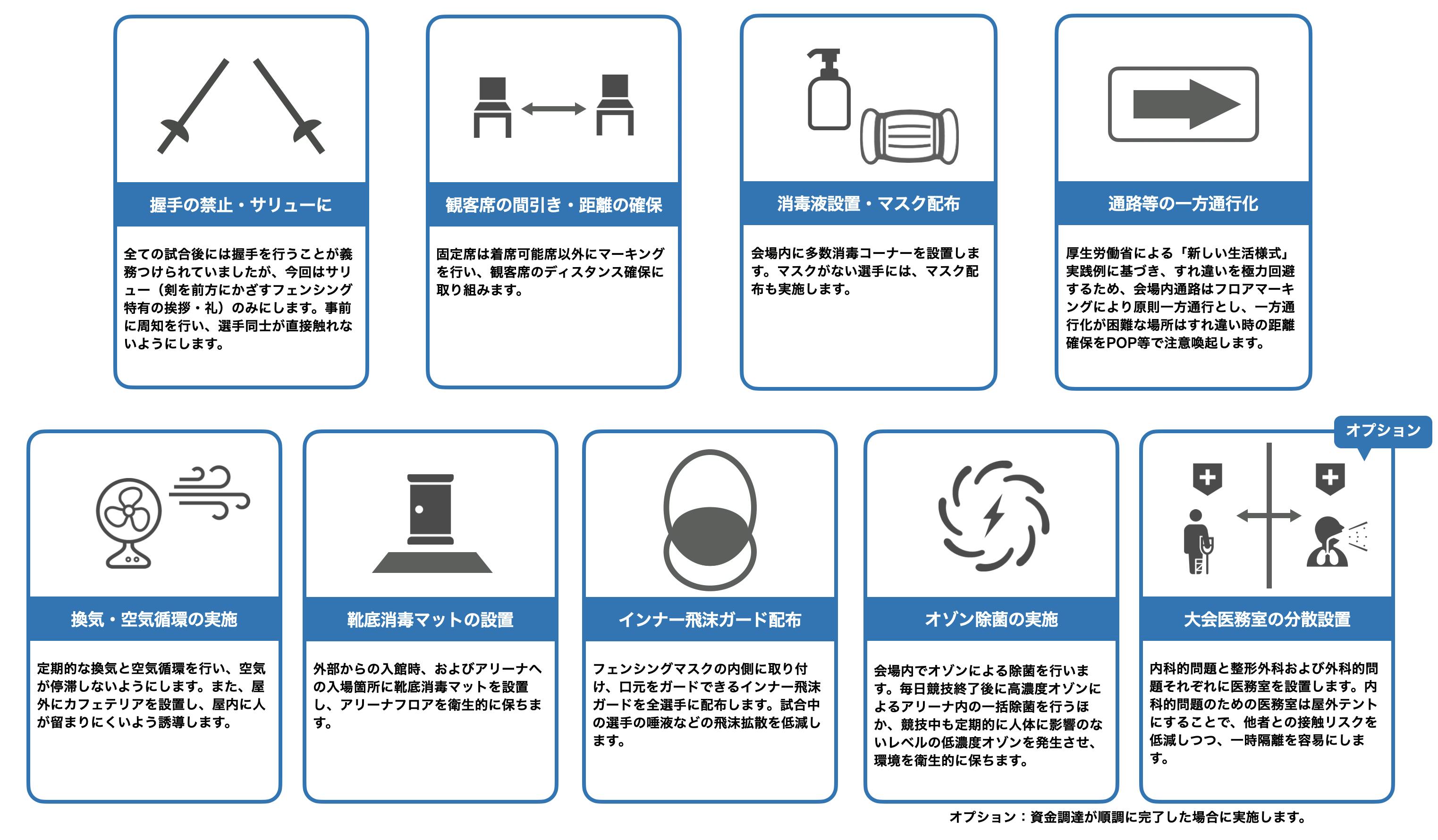 根本的な安全策は、前述の開催スケジュールをスライドさせることです。その上で、AプランまたはBプランで大会開催できる場合には、スポーツ庁、日本スポーツ協会、厚生労働省など関係省庁・団体のガイドラインを参考に、フェンシング競技に必要かつ実現できる安全対策を講じています。主催者だけではなく、協力団体・企業等のご支援のもと、これらの対策の実行に向けた準備を進めています。ポストコロナにおけるフェンシング競技会のロールモデルになれるような取り組みを目指しています。