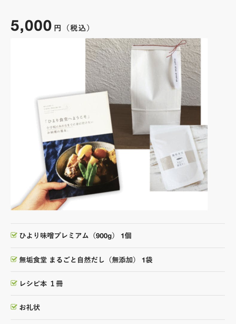 「レシピ本」「ひよりプレミアム味噌」「無垢食堂のだし」の三点セット