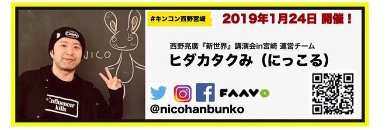 もしよろしければ、ご友人、ご家族の方に、1月24日、キングコングの西野亮廣さんが宮崎に来るよとお誘いして頂けると凄く嬉しいです(*^-^*)b