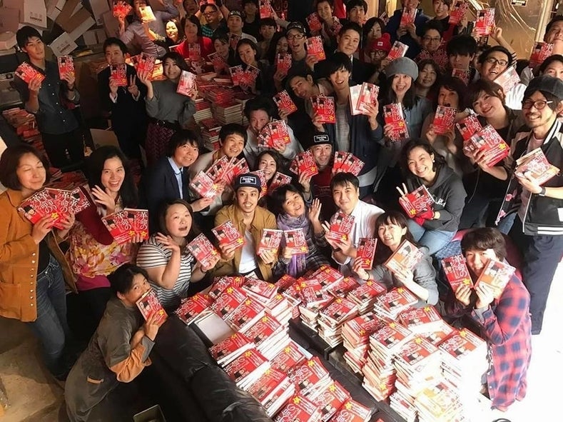 写真:2017年秋、全国の図書館に『革命のファンファーレ』を届ける為、全国から集まったオンラインサロンの仲間達と西野亮廣さん。中央の真ん中辺り、西野さんと同じ帽子を被ってるのが主催の私です。