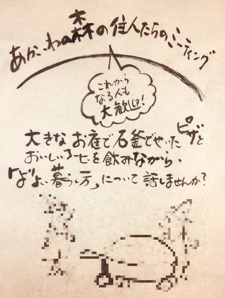 大きなフライパンで、大きなピザをつくる2匹の森の住人たちが描かれています。筆だけで素敵なイラストとメッセージが書けるのはすごいですね!ありがとうございました!