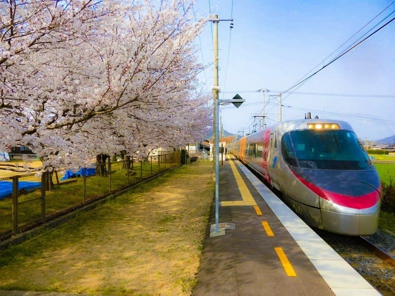桜満開の鉄道ミュージアムパークカフェ横を走る特急電車しおかぜ