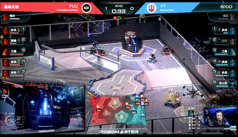 試合は基本的にロボット同士による弾の打ち合いです。 各チーム自分たちで開発した5種類のロボットを駆使して、相手の基地ロボットのHPを0にした方が勝利となります。 ロボットを操縦するオペレーターは直接フィールドを目視することはできず ロボットから送られてくる一人称視点の映像をPCで確認して操縦する点もeSportsに近いと言えるでしょう。