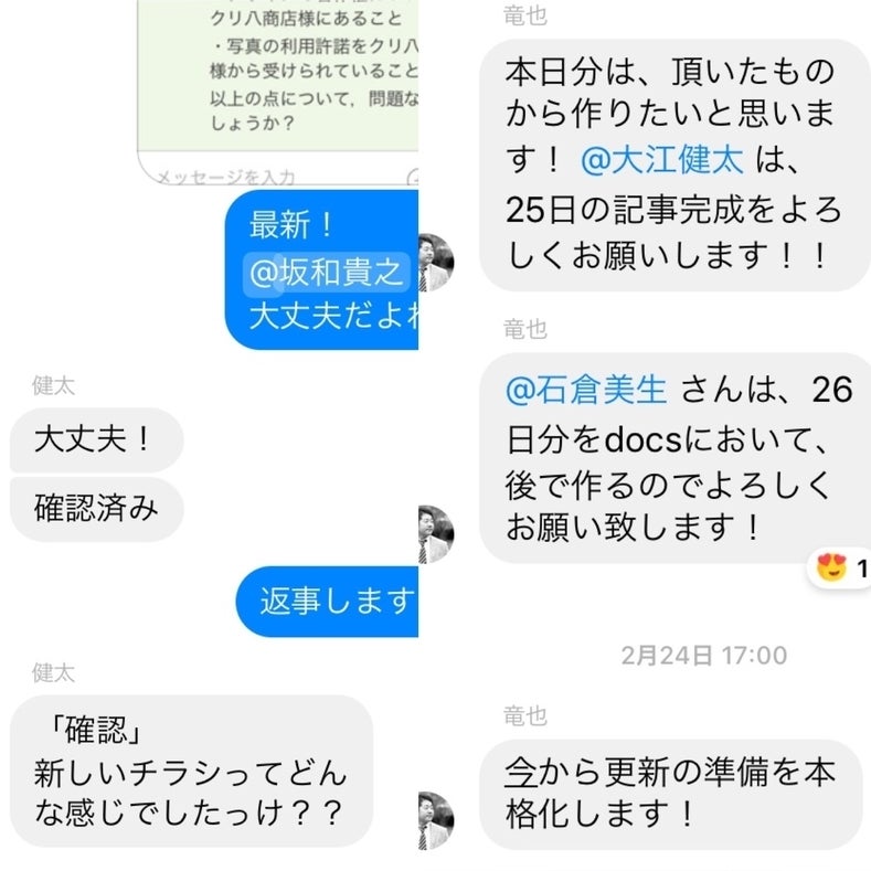 「今日は、~が記事の担当だよ!」という業務の連絡から、「今、支援がはいったね!!」「これ、今対応できる人いる??」など、役割分担を決めつつも、その時にできる人ができる精一杯をやる!という「ボランティアの精神」で活動しています!