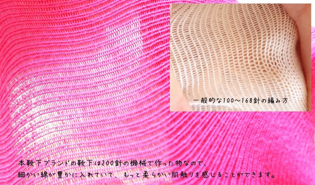 「本靴下」の靴下は200針編み機で30番手の綿繊維で製造します。生地は薄い感じなく、一番肌触りの良い太さです。その糸を使用し、200針編み機で製造しています。現在、靴下製造業界に200針編み機が一番精巧な編み機械です。普通の靴下より細かい糸をもっとも豊かに含有されている靴下だから、肌触りが良く、吸収性も優れます。弾力性も良い、すぐにぐじゃぐじゃになりません。