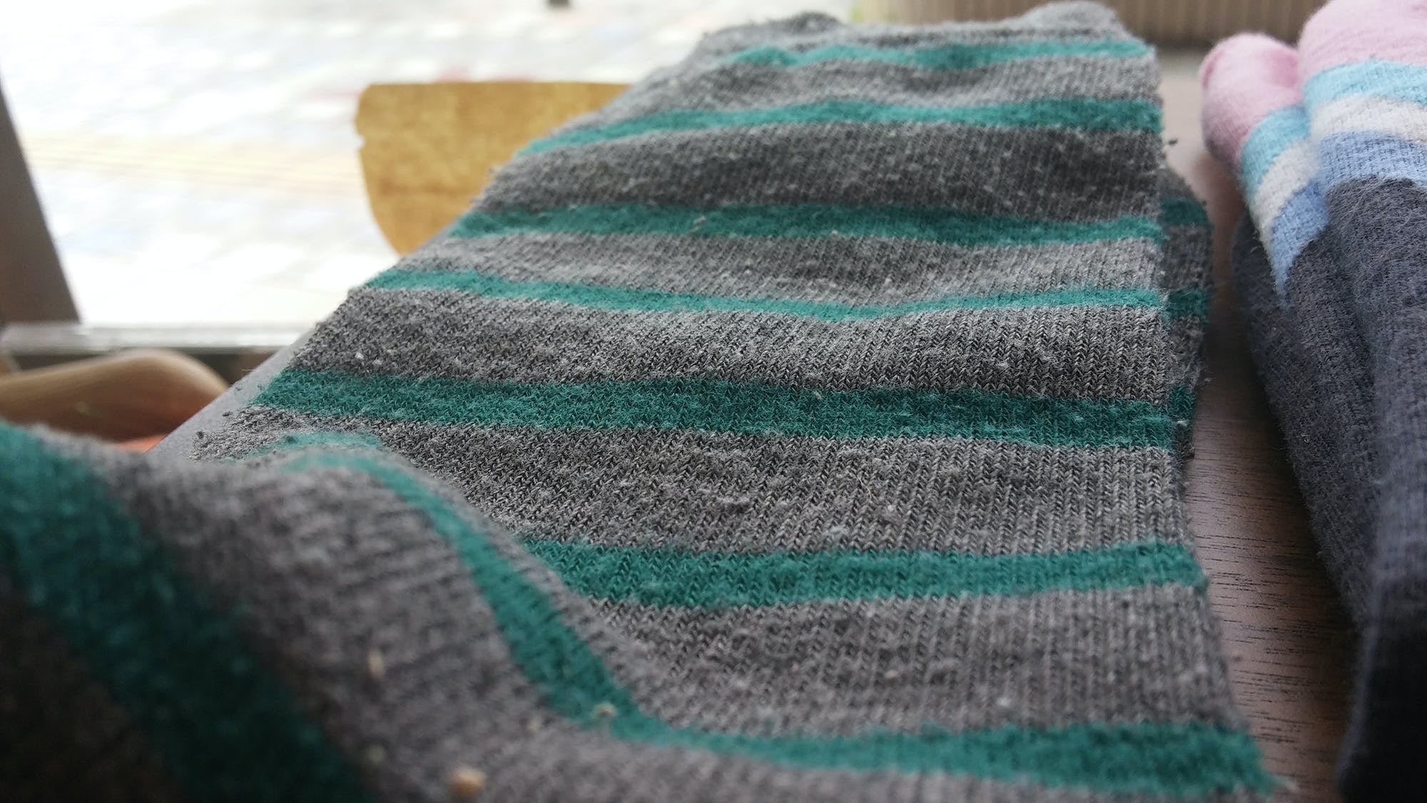 本靴下の靴下の毛玉は普通の靴下とは違います。世の中に毛玉が出ない繊維はないですが、綿繊維の含有率が高い場合は丸形ではありません。写真の通り子猫の毛のように細かい糸がもふもふしています。写真の靴下は僕が数ヶ月間着用したものです。