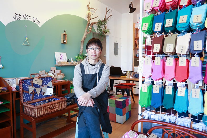店舗には約200種類の靴下が揃えています。僕が直接にデザインしたオリジナル靴下ど他のブランドから仕入れている靴下もあります。