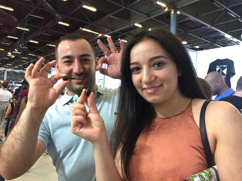 男性の帽子についたピンク耳が、彼女への愛を物語っているようで