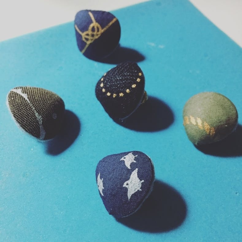 対が見つからなかったものは、ピンバッジやくるみボタン・帯留めなどに仕上げます。 稀少な2L〜3Lサイズが溜まったときにだけ作ることができる帯留め。 裏の金具がすっぽり隠れる超大粒のものでないと作れないのです! こちらはピンバッジ。 真ん中から時計回りに「えん」・「しめなわ」・「千鳥」・「夕景」・「むすび」。 松江や出雲の風景などをモチーフに、ひとつひとつ手描きで仕上げています。