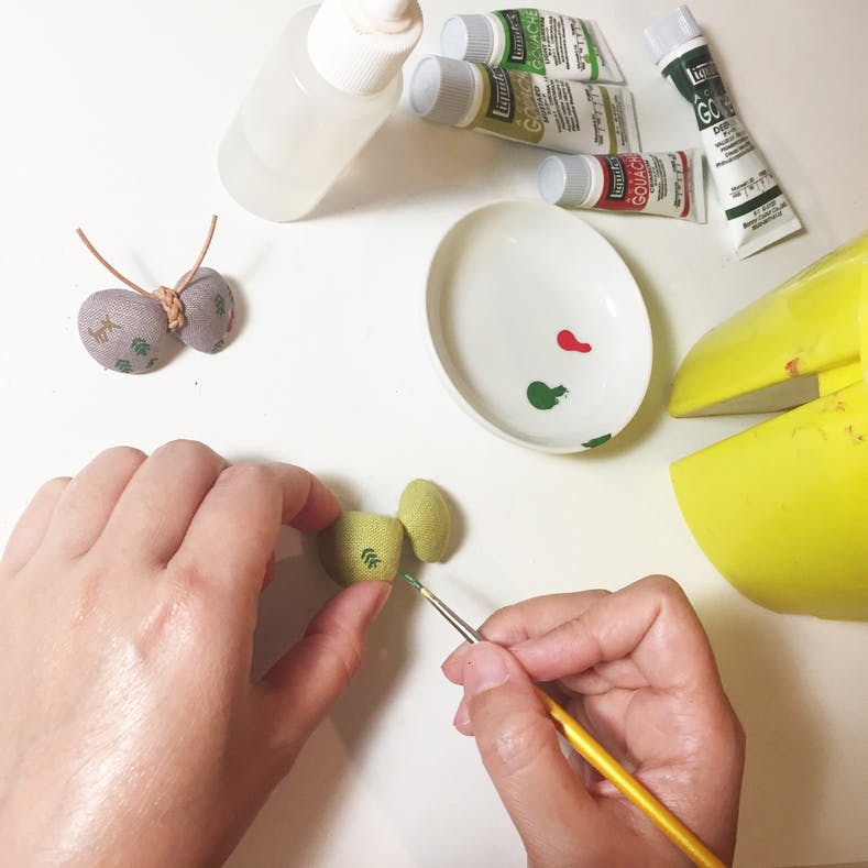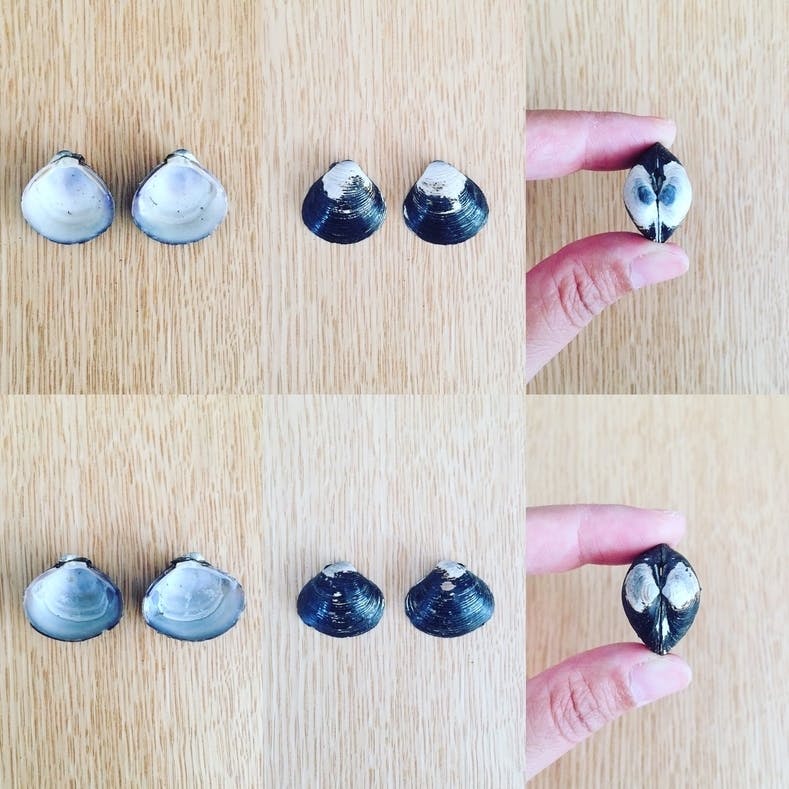トップページ写真にも使用している、しじみちょうの代表作しじみちょうブローチ。こちらは「L〜2L」サイズで作ります。 対の貝殻をそれぞれ布で包み、縫い引き締めてから、ちょうちょの羽に見立ててつなげます。 胴体部分は正絹組紐や革紐、藤などを編み込んで太さを出して。 触覚と裏地、ピンを付けてできあがりです。 物によっては、ここへアクリル絵具で絵付けをしていきます。 一発勝負なので集中!! 他にも「SS」でしじみちょうイヤリングや、 「S」で一対ピアス・イヤリングやドロップピアス 「M」でドロップネックレス・キルトピン など、粒のサイズ感を活かして加工します。