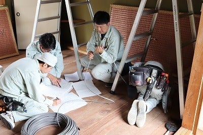 配線工事に車4台、職人さん6人来られました、営業の原さん入れると7人。やはり大掛かりな工事となりました。