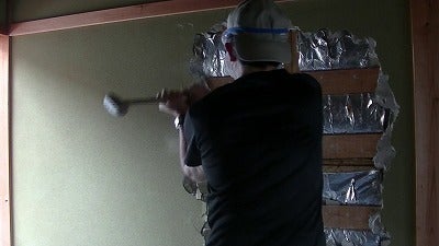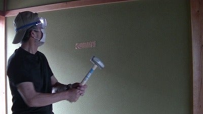 先日の反省、電動工具を使うと粉塵が舞い上がり、試しにハンマーでたたくと、あまり粉塵があがらず、それに変更。新たな経験値。