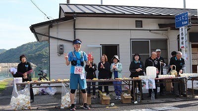 片江では、住民ボランティアで飲み物、バナナや梅干しなど渡し、声援を送りました。