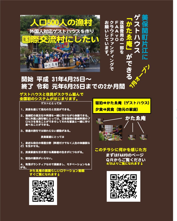 クラファンこれからやる方に参考になればと。 最初が肝心と言われ、7000枚のチラシを作った。 faavoさんにこんな事やれと言われてないのに。 それをクラファンスタートまでに、事前に配っていった。 これがそのチラシ。 faavoさんからはSNSをやらないといけないとは、いわれましたが。 イラストレーターで作り、ラクスルで印刷。 因みにA5、表印刷のみ、7000枚で、いくらだったでしょう。(最後に答えがあります) 実はこれ、何かが間違っています。 今となれば人生にはトラブルがつきものを教えてくれた、笑える思い出のエピソードです。(この答えは教えません、でもわかる人にはわかる) このチラシが活躍したのが、本庄公民館の山内館長。 館長がこのチラシをもって、かまいたちのお父さん、と紹介。 これはアクセスを増やすに大きく貢献していただきました。 そして、作ったのが垂れ幕。 これもイラレで。写真も。 オリジナルタペストリー作成 ワイドサイズ 900mm×1800mm のぼり印刷ドットコムで、いくらだったでしょう。(最後に答えがあります) このタペストリーは活躍の場がいろいろありました。 新聞に載った写真にはちゃんとこれをもって写していただきましたので クラファンの宣伝効果は抜群でした。 ぜひ作っても損はありません。 名刺の裏 宣伝を兼ねた内容です。 因みに、ご紹介する機会がなかったので この場をかりてご紹介します。 たびたびこの甲冑をきた外国人が登場してますが 彼はイタリアの友人です。 一度ホームステイを受けてから、もうイタリアから3回来てくれて います。 昨年の5月来た時に、なんでこんないいときに来てくれたんだと、 つくやいなや すぐ片江に連れって、甲冑を着てもらい、撮影をしました。 今はフランスにいて、いつかまたかたゑ庵にくると思います。 何人泊まれるか聞いてたので、 ひょっとすると会社の人を連れてきてくれるのかと 期待してます。 下のフランス語はまたどなたか訳してみてください。 かたゑ庵の挑戦的な内容です。 読みにくいのでこちらで Il n'y a aucune raison de ne pas venir dans cette maison d'hotes 私自身、解体工事だけでなく、 できるだけ自前でやって経費をいかに落とすかの挑戦でもありました。 それはこれからまだまだ続きます。 かたゑ庵へ足を運んでいただければ、そのためのいろいろな話、 ほとんどが失敗談ですけどね。 聞けるかも。 さて正解は ラクスルでA5、表印刷のみ、7000枚で1万円。 のぼり印刷ドットコムで一枚4,612円 反省は、チラシは作りすぎた感あります。 以上です。
