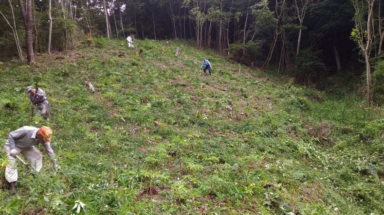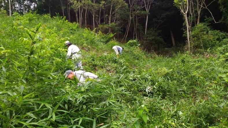朝8時半から、30人程が集まり、斜面の下から上に向かって一斉に草刈りスタート!