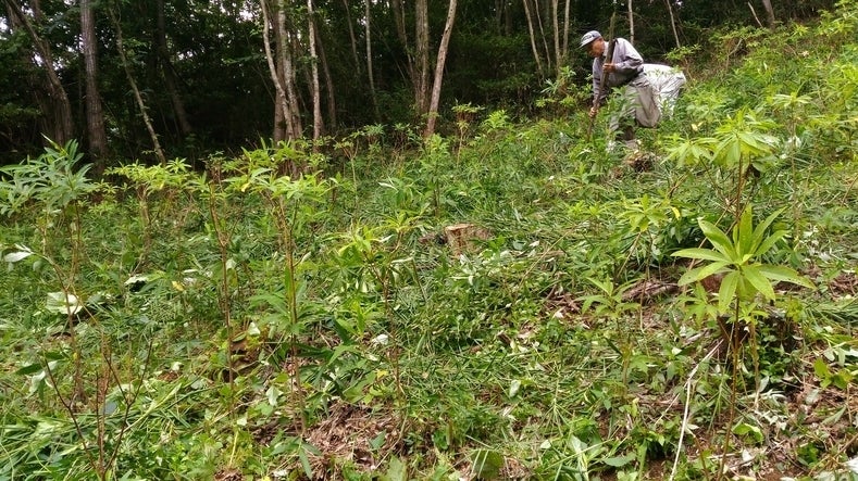 三椏の間を刈っていくため、草刈り機が使えないので、みんな鎌を持ち、三椏を切らないように注意しながら刈っていきます。