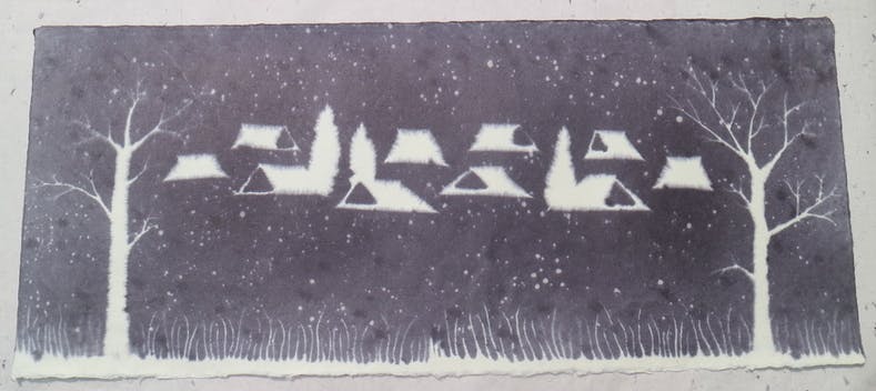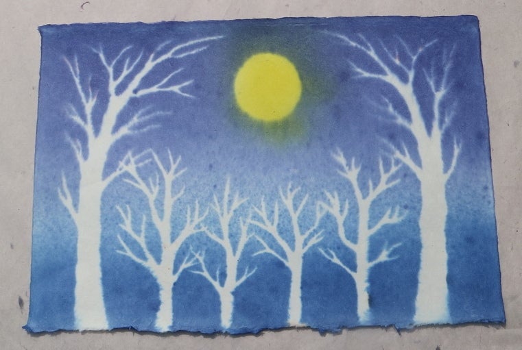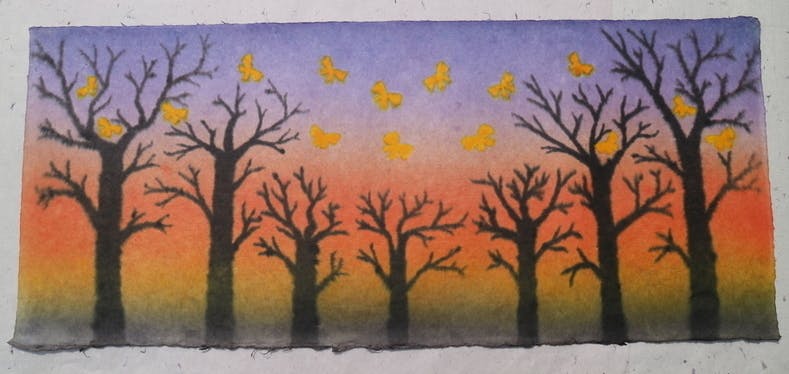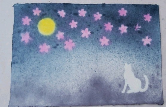 36cm×53cm 春の夜桜をみる猫、夏の銀河に飛ぶ幸せの鳥、秋の夕焼けの空に飛ぶ蝶、冬の雪景色の中の月 の4点を、自分の中にある生きることの儚さ、寂寥感をインスピレーションで表現してみました。
