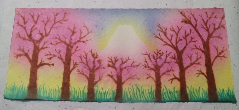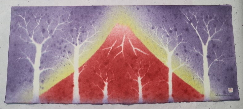 他にも、大きいサイズの創作染和紙 夢幻もあります。 44cm×104cmの 富士と桜、赤富士、落日夢、雪景色です。