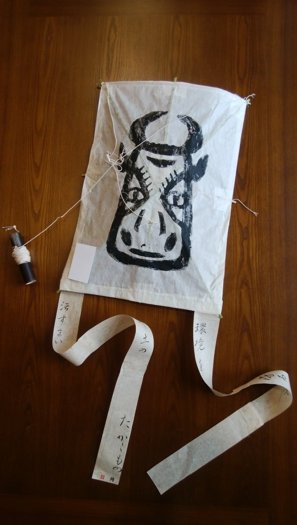 なんと、凧のしっぽまで樫西和紙!標語入りのカレンダーを再利用しています。