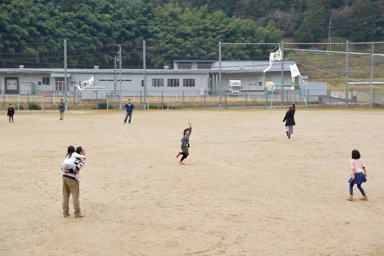 思い思いの凧が完成した後は、もちろん凧揚げ! 大人も子どもも、運動場いっぱい走り回って楽しみました。
