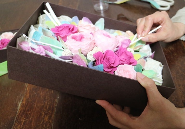 樫西和紙工房の創作染和紙デザイナー、星野詩穂制作の染和紙で作られた箱の中に、「おがら」に着色したものを染和紙やプリザーブドフラワーと組み合わせ、美しく展開しています。