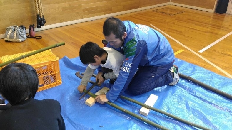 今では、親世代も竹馬の作り方を知らない…ということで、12月、ベテラン世代に先生になってもらい、親子竹馬づくり教室を開催しました。