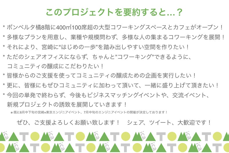 「何かをやってみたい」という気持ちのある個人様や会社様が気軽に初めの一歩を踏み出せる環境を、この宮崎に作り上げます。