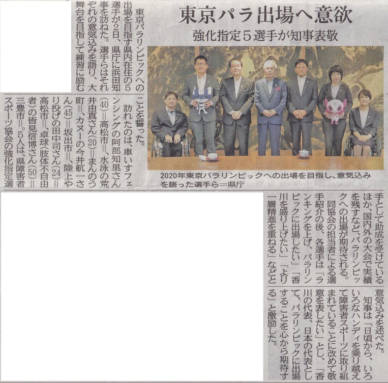 今年度、香川県障がい者スポーツ協会の強化指定選手Aランクに認定された今井選手を含む県内在住の5人の選手が県庁を訪れ、浜田知事の激励を受けました。