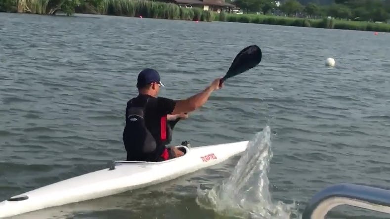 ↓↓せっかく木場潟まで来たので、その作製の時間の合間を縫って、カヤックの練習をする今井選手!