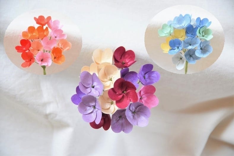 一輪が2センチの小さな花を集めた手のひらサイズの花束です。一輪に5枚の花びらで、15輪程度で1束なので、全部で75枚の花びらが使われています。意外と手間がかかっています。