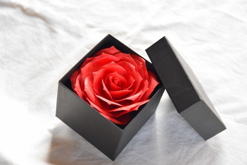 文字通り箱入り娘です。直径が8㎝以上ある大輪のバラは、存在感抜群です。特注の箱に入っていますので、そのまま飾って頂けます。水やり入らずで長らくお花を楽しむことができます。私のつくる花はどれもですが、出来上がって並べると、1輪1輪表情が違います。世界に一つだけ。