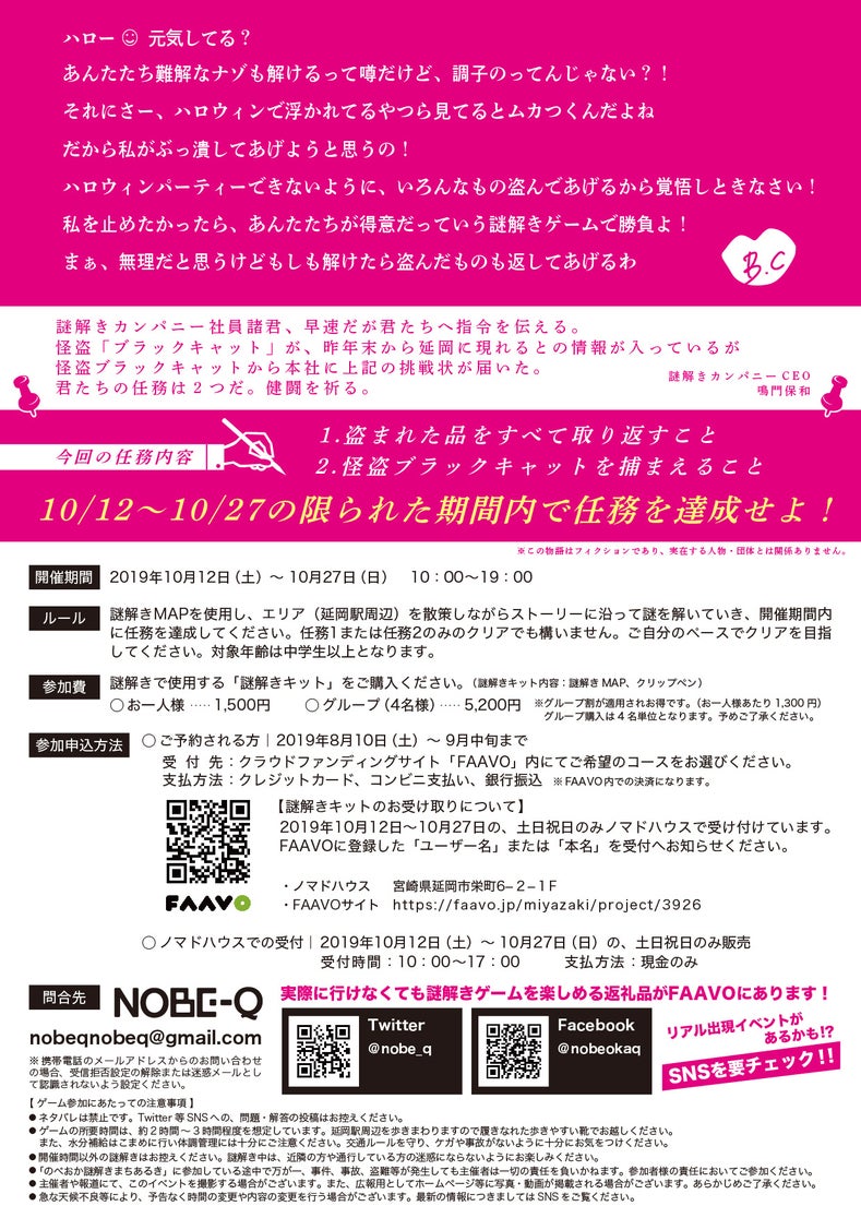 「謎解きゲーム」自体に興味がある方だけでなく、延岡を応援したい方、わたしたちの活動に賛同していただける方など、どうか皆さんのご支援をよろしくお願いいたします。