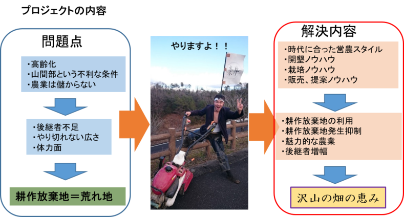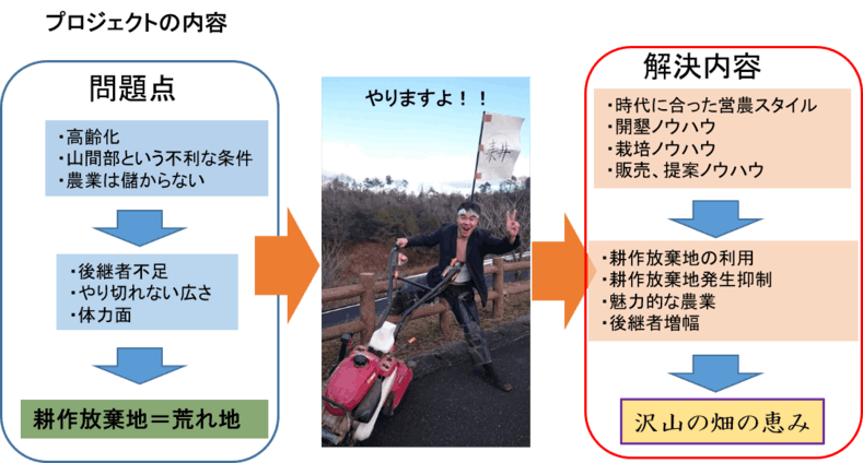 農村が抱える営農維持継続への問題点と、消費者の抱える日本農業への不安との間に立つ「若手農家」として感じる、社会的な問題点を克服していくためのプロジェクトです!
