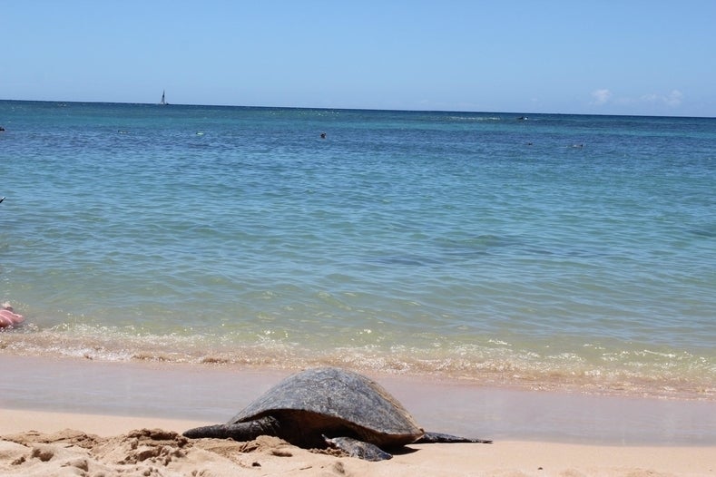 ビーチで休憩するアオウミガメ。その背中は何か語っているように見えます。