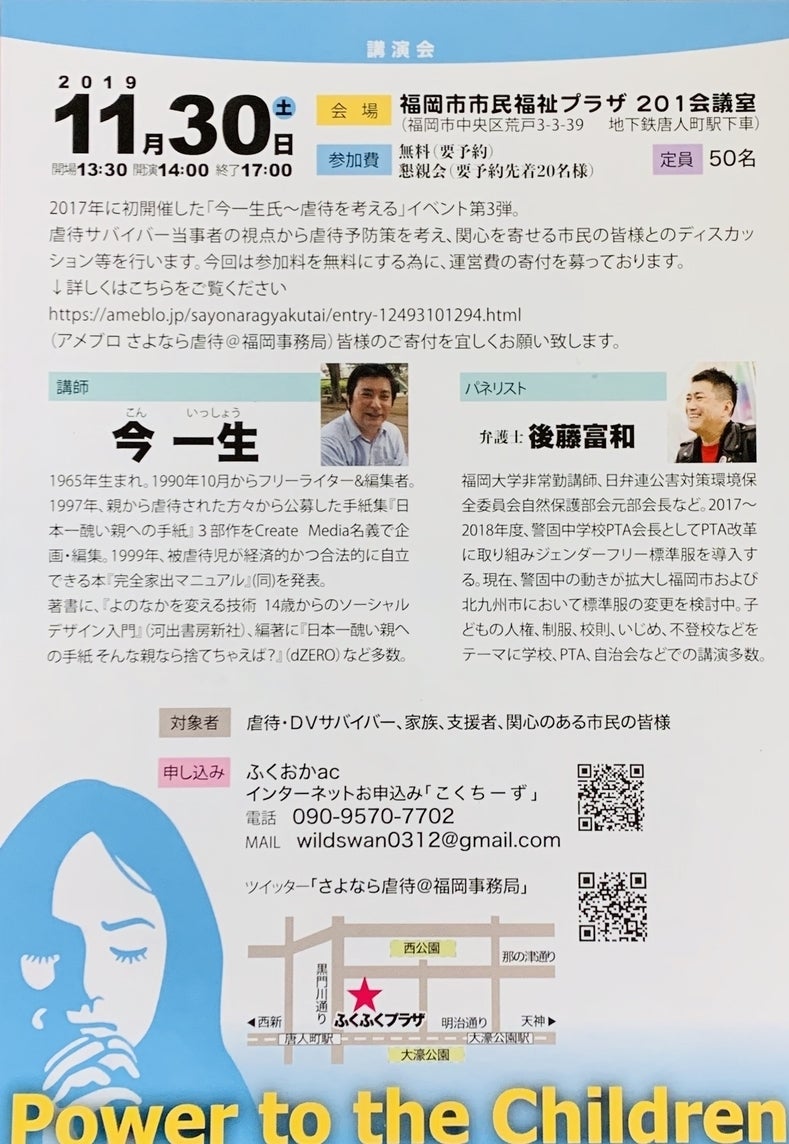 同時に【虐待を予防する全国ツアーPower to the Children】の開催をノーギャラにて開始。神戸をはじめとして大津、大阪、札幌、函館、東京八王子、名古屋、千葉、市原、早稲田大学、東京新宿、仙台、福島、川崎、沖縄、そしてここ福岡でも2017年11月11日に開催。(全国では累計19箇所で開催)。